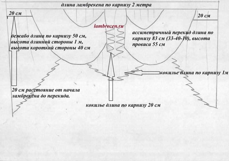 Чтобы занавески с ламбрекенами хорошо выглядели, они должны быть не просто качественно сделанными. Нужно, чтобы они хорошо «сидели» на самом карнизе. Чтобы этого добиться, надо произвести несколько измерений, с учетом которых и будут сделаны выкройки. Чтобы определить ширину изделия, надо узнать расстояние между наружными кронштейнами, которые закреплены над окном. Рекомендуется сделать припуск в 2,5 м.