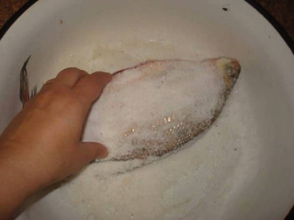Шаг 5. Остальной солью хорошо натираем леща со всех сторон и обязательно внутри.