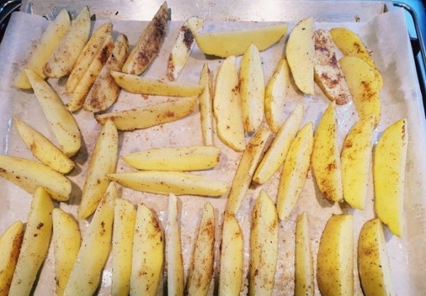 Противень застилаем фольгой или силиконизированным пергаментом. Раскладываем картофельные дольки так, чтобы они не соприкасались друг с другом.