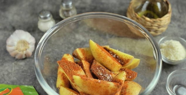 Шаг 2. Картошку делим на дольки. Помещаем в глубокую чашку. Сдабриваем приправами. Солим и перчим.