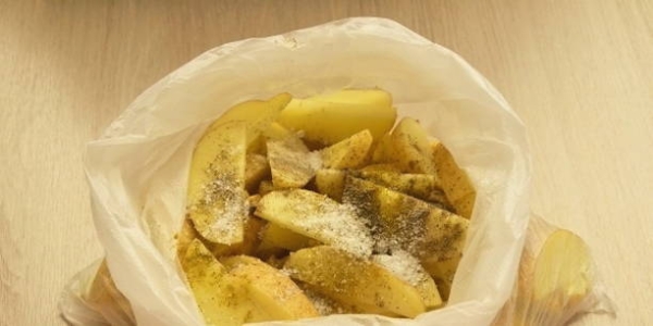 Шаг 2. Клубни моем и избавляемся от влаги. Разрезав клубни пополам, делим их на дольки. Складываем в пакет.