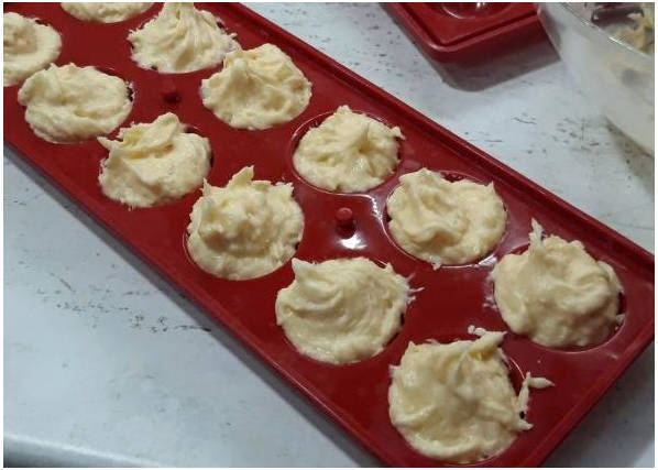 Шаг 6. Выкладываем тесто в небольшие круглые силиконовые формочки.