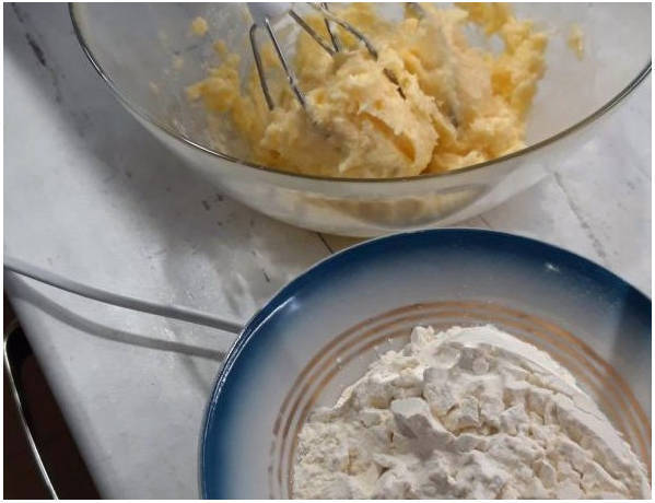 Шаг 4. В массу с желтком просеиваем муку. Вымешиваем.