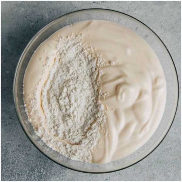 Шаг 4. Просеиваем сюда муку с разрыхлителем. Вымешиваем до исчезновения комочков.