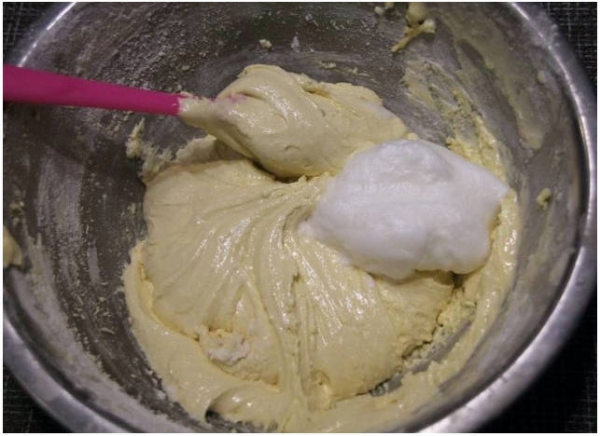 Шаг 5. Постепенно добавляем взбитый белок и лимонную цедру. Перемешиваем заготовку.