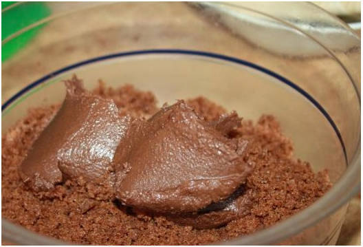 Измельчаем шоколадный бисквит и вымешиваем его с шоколадной пастой.