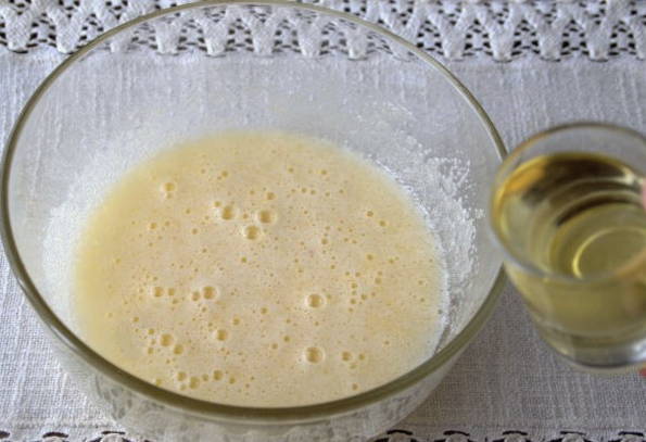 - Взбиваем яйца с сахаром и постепенно вливаем сюда подсолнечное масло с кефиром. Продолжаем взбивать заготовку.