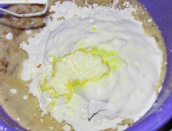 - Отправляем сюда муку с разрыхлителем и размешиваем, пока не разобьем все комочки. Рекомендуется муку в тесто просеивать, чтобы выпечка вышла более пышной.
