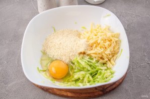 Добавьте к кабачку натертый сыр, куриное яйцо. При необходимости посолите.