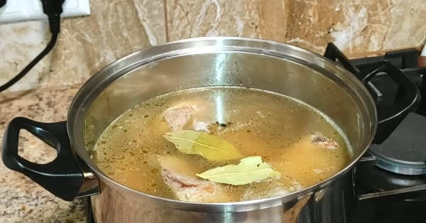 - Говядину нарежьте кусочками и отправьте в кастрюлю. Залейте ее водой и доведите до кипения под крышкой на сильном огне. Далее соберите пену, огонь уменьшите до среднего. В бульон добавьте лавровый лист, перец чили и 2 очищенные луковицы. Варите суп 1 час.Тем временем порвите 30 г кислой пастилы на небольшие кусочки, залейте ее половником бульона, чтобы та размякла. Отменно подойдет пастила из кислой сливы. Еще часть бульона налейте на сковороду.