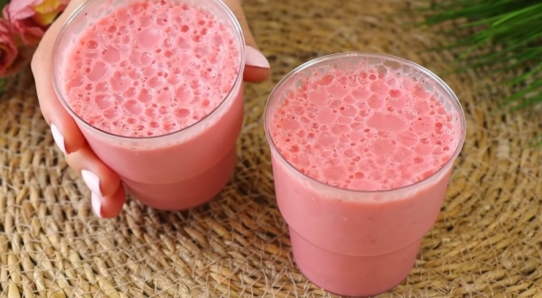 Взбиваем всё погружным блендером до однородности и появления максимально большого количества пузырьков на поверхности клубничной смеси.Берем 2 стакана объемом 200 мл. Наполняем их ягодной смесью. Отправляем стаканы на 2 часа в холодильник до полного застывания десерта.