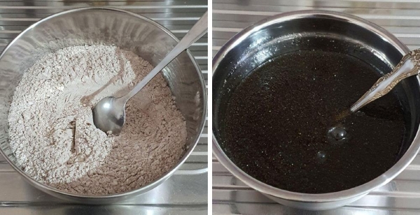 - Всыпаем в чашку растворимый кофе. Доводим воду до кипения. Заливаем ею кофе и перемешиваем. Оставляем напиток при комнатной температуре для остывания.В глубокую емкость всыпаем просеянную пшеничную муку. Добавляем какао-порошок и соль. Вливаем к сухим ингредиентам слегка остывший кофе. Хорошенько всё перемешиваем.