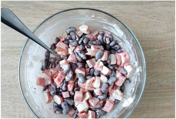 Шаг 10. Крабовый салат с консервированной фасолью готов. Подавайте закуску к столу!