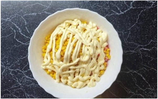 Шаг 5. Соединяем все продукты в салатнице. Дополняем кукурузой, из которой предварительно сливаем жидкость.