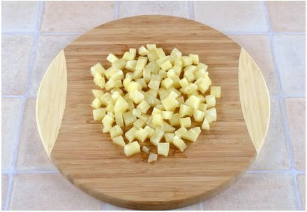 Шаг 4. Достаем ананасы из банки и режем таким же кубиком, как и крабовые палочки.