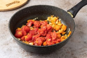 Затем добавьте томаты в собственном соку. Посолите и поперчите овощи, добавьте все специи. Готовьте еще пару минут.