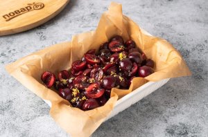 Черешню помойте, удалите косточки и разрежьте пополам ягоды.