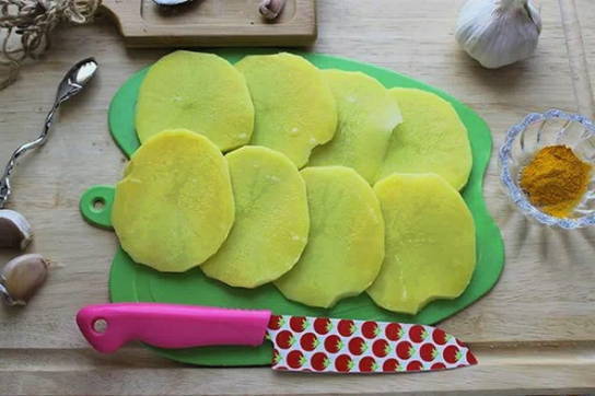 Шаг 5. Картофель чистим, промываем и нарезаем максимально тонкими колечками.