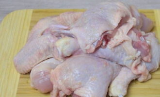 Курица с картошкой в духовке готовится быстро и просто. Курицу разрезаем на порционные кусочки, ополаскиваем и укладываем в миску.