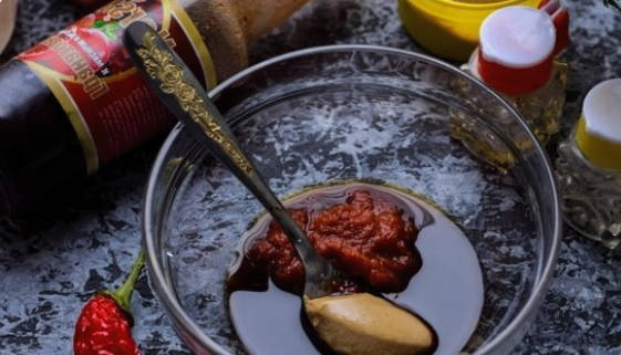 Шаг 7. В это время готовим соус: в пиале смешиваем три разных соуса и горчицу.