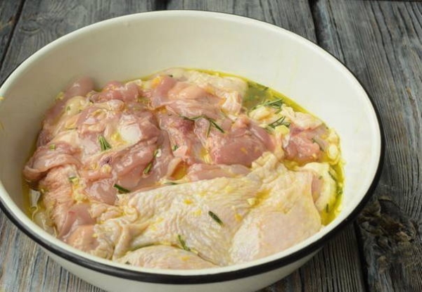 Шаг 5. В пряную ароматную масляную массу опустите мякоть куриного бедра. Перемешивайте мясо руками, следите за тем, чтобы маринад разошелся по всему мясу. Оставьте бедра мариноваться на 30-50 минут или чуть больше при комнатной температуре. Если хотите оставить на более длительное время, то поместите миску с мясом в холодильник.