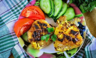 Шаг 5. Проткните курицу ножом, если сок идет прозрачный, то она полностью готова. Промокните мясо от жира на салфетках. Подавайте жареные куриные бедра с хрустящей корочкой с гарниром из каш и овощей. Приятного аппетита!