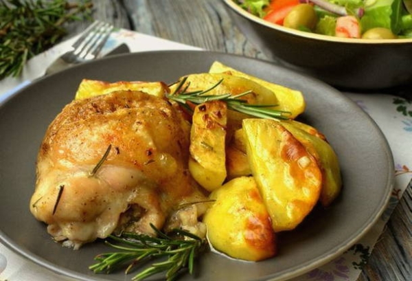 Шаг 10. Разложите запеченные куриные бедра и картошку по порциям, украсьте веточками свежего розмарина и подавайте на стол. Приятного аппетита!