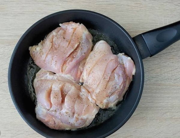 Шаг 3. На разогретую сухую сковороду влейте растительное масло. Затем выложите куриные бедра и жарьте их 3-4 минуты с одной стороны. Затем, когда кожа подрумянится, переверните мясо и жарьте столько же с другой стороны. Выложите мясо из сковороды на тарелку.
