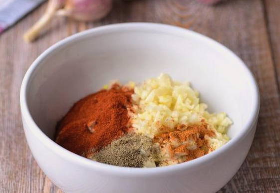 Шаг 5. Сюда же продавливаем чеснок и отправляем специи. Хорошо все перемешиваем.