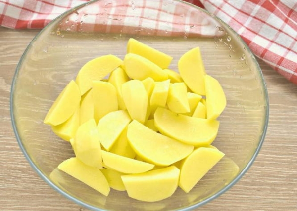 Шаг 2. Подготовленный картофель разделываем на аккуратные дольки и выкладываем в миску.