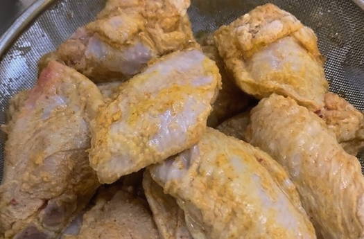 Шаг 4. Далее крылышки перекладываем на сито и обливаем водой, тем самым стряхиваем лишнюю муку.