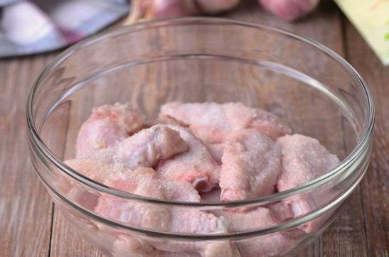 Шаг 6. Крылышки складываем в глубокую миску, посыпаем их солью и перемешиваем.