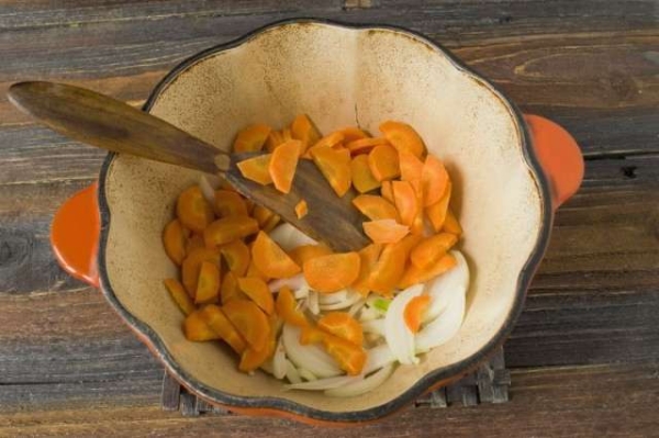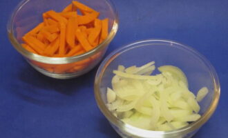 3. Натираем морковь и нарезаем полукольцами лук. Отправляем овощи к желудкам.