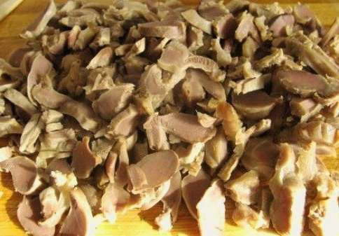 2. Готовые субпродукты остужаем, а после нарезаем на мелкие кусочки для салата.