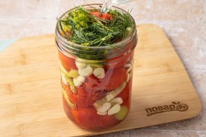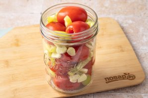 Плотно заполните банку помидорами, а пустые места заполните болгарским перцем и чесноком.