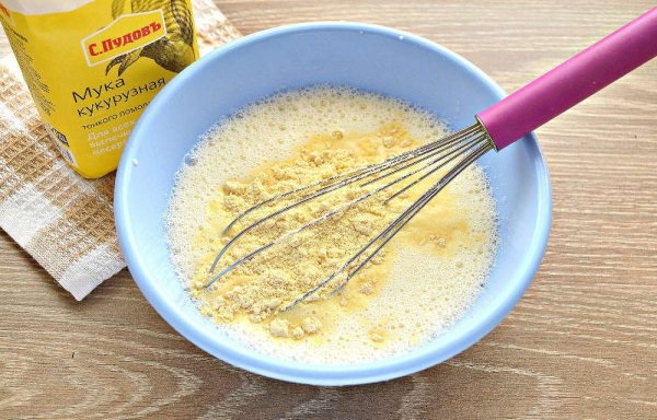 - Слегка подогрейте молоко. Влейте его в глубокую миску. Вбейте в молоко яйца. Добавьте соль и сахар. Взбейте всё венчиком до однородной консистенции. Постепенно всыпьте в яичную смесь кукурузную муку. Хорошенько перемешайте все ингредиенты. Влейте 2 ст. л. подсолнечного масла. Перемешайте венчиком до однородности.