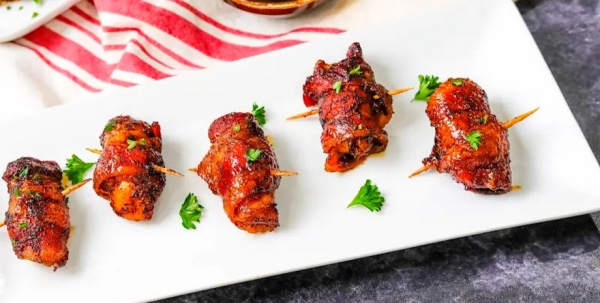 Закуска из курицы в беконе по рецепту Фокуса — это вкусное и простое блюдо, которое отлично подходит для просмотра телевизионных игр или для сбора друзей. Это сочетание кусочков курицы, обмакнутых в остром соусе для крыльев, обернутых в соленый бекон и посыпанных смесью из коричневого сахара и чили. Выпекаясь в духовке, они становятся хрустящими снаружи и сочными внутри, а сладкий и острый вкус просто незабываемый!