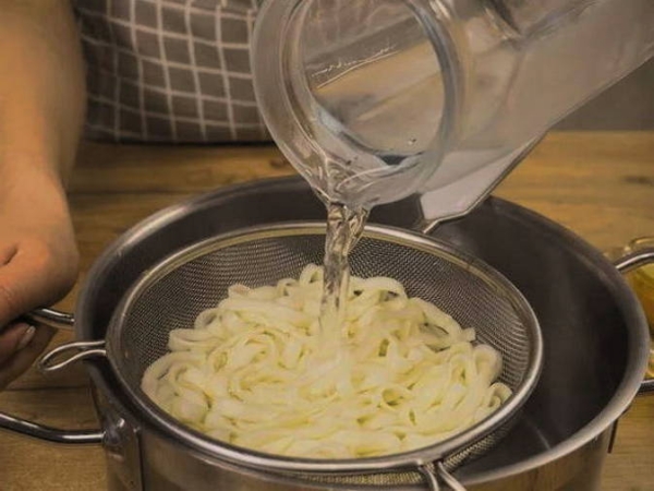 Шаг 1. Сразу отварить выбранную лапшу удон согласно инструкции на упаковке. Затем ее откинуть на дуршлаг и обязательно промыть холодной водой.