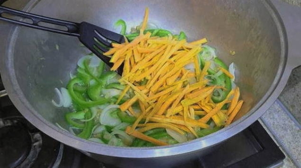 Шаг 8. Затем в вок переложить нарезку перца с морковью и жарить 2 минуты.