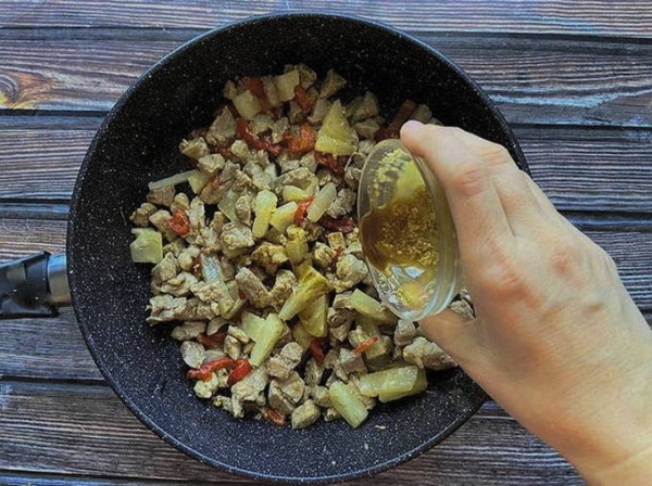 Шаг 9. Обжаренные ингредиенты залить соевым соусом и добавить по вкусу острый перец.