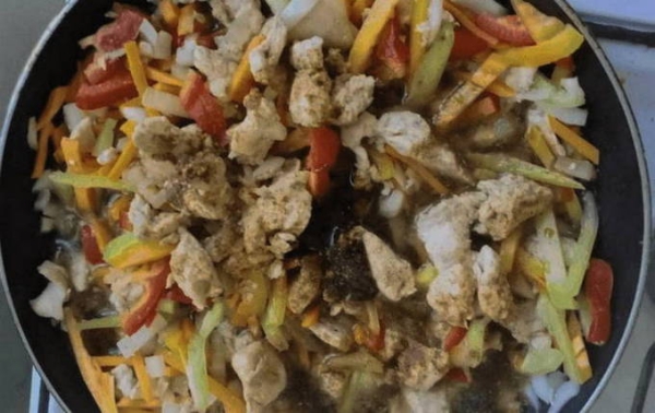 Шаг 2. Обжаренные овощи по своему вкусу посыпать солью с приправами, добавить нарезку куриного филе и так же на большом огне и при помешивании обжарить в течение 7-10 минут.