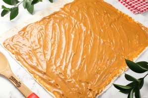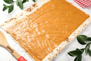Тонкий лаваш выложите на ровную рабочую поверхность. Если у вас нет времени на пропитку десерта, то можно смазать лаваш силиконовой кисточкой сахарным сиропом или сладким чаем. У меня длинный лаваш, я разрезала его на две равные части, если у вас небольшой квадратный лаваш, то возьмите две штуки. Лопаткой распределите крем ровным слоем, не доходя немного до одного края.