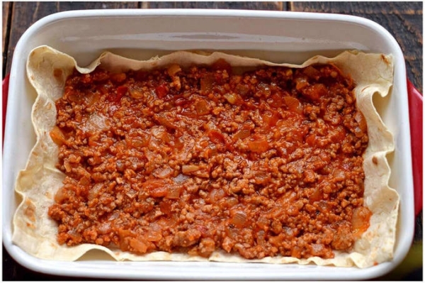 Шаг 11. Распределяем мясную начинку и повторяем слои, пока не закончатся ингредиенты.