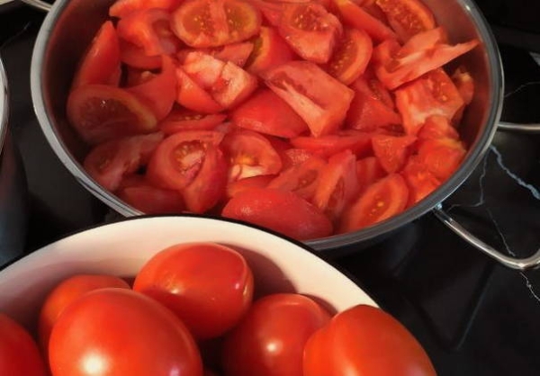 Шаг 1. Разделяем томаты для приготовления лечо без уксуса и масла на зиму. Два килограмма оставляем целыми. Остальные делим на дольки, складываем их в кастрюлю и ставим на плиту для закипания.