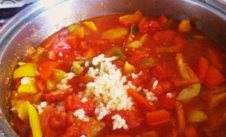 Кипятим томатную смесь в кастрюле и выкладываем в нее перцы. Варим массу около 10 минут.