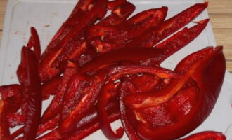 Шаг 6. Очищенные перцы режем на небольшие кусочки.