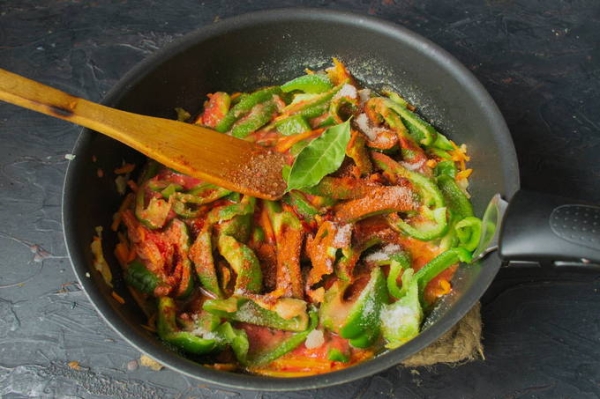 Шаг 3. Режем болгарские перцы соломкой и выкладываем их в сковороду к остальным овощам.