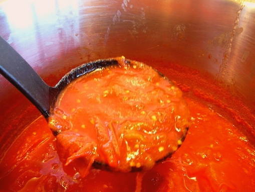 Шаг 6. Измельченные помидоры кипятим на умеренном огне. В процессе снимаем пену.