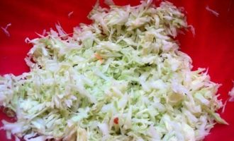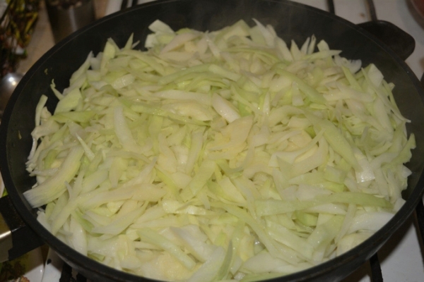 3. Очень мелко нашинкуйте капусту, добавьте ее в сковороду с морковью, луком и небольшим количеством растительного масла.