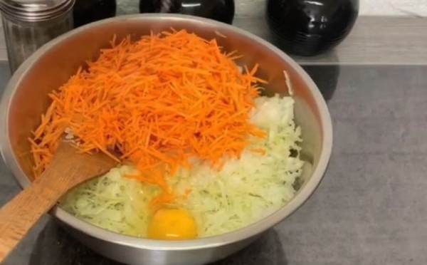 5. Обжаренные овощи смешайте в миске с фаршем, капустой и рисом, добавьте соль и специи по вкусу.